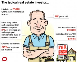 Private data from a major mortgage provider used in my research (for the period 2003-09) reveals what the typical real estate investor looks like. They are on average 42 years old; 72 per cent are married; and fewer than two-thirds of investors get finance with a co-borrower. Only a third of investors are female.